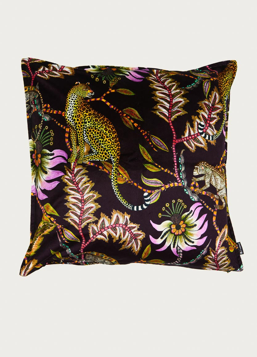 Ardmore cushion cover features monkeys and leopards with flowers and foliage. This cushion cover was made by local artists and seamstresses in South Africa. At Ardmore, all motifs are first hand-drawn before being digitised and printed onto the fabric.