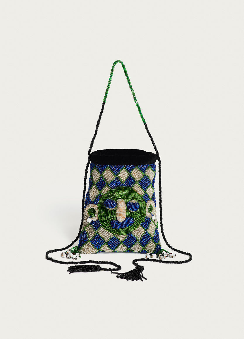 Cecily Ophelias Harriet Bag is a beaded evening bag featuring a face and checked pattern on the front and back, two beaded tassels in bottom corners, and adjustable beaded strap with tasselled ends. This blue and green bag was handcrafted by Harriet from Kanyoyga Mums, a group of single mother artisans based in the Kangogoga district of Kampala, Uganda.